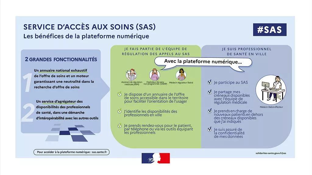 Le SAS constitue un niveau de réponse supplémentaire, mobilisable pour tout patient qui n’a pas trouvé de réponse à son besoin par ses propres moyens. Il ne se substitue pas pour autant au médecin traitant, et ne constitue pas une solution de prise de RDV en ville chez les généralistes : il permet simplement de centraliser l’information sur l’offre et la disponibilité pour des soins non programmés.