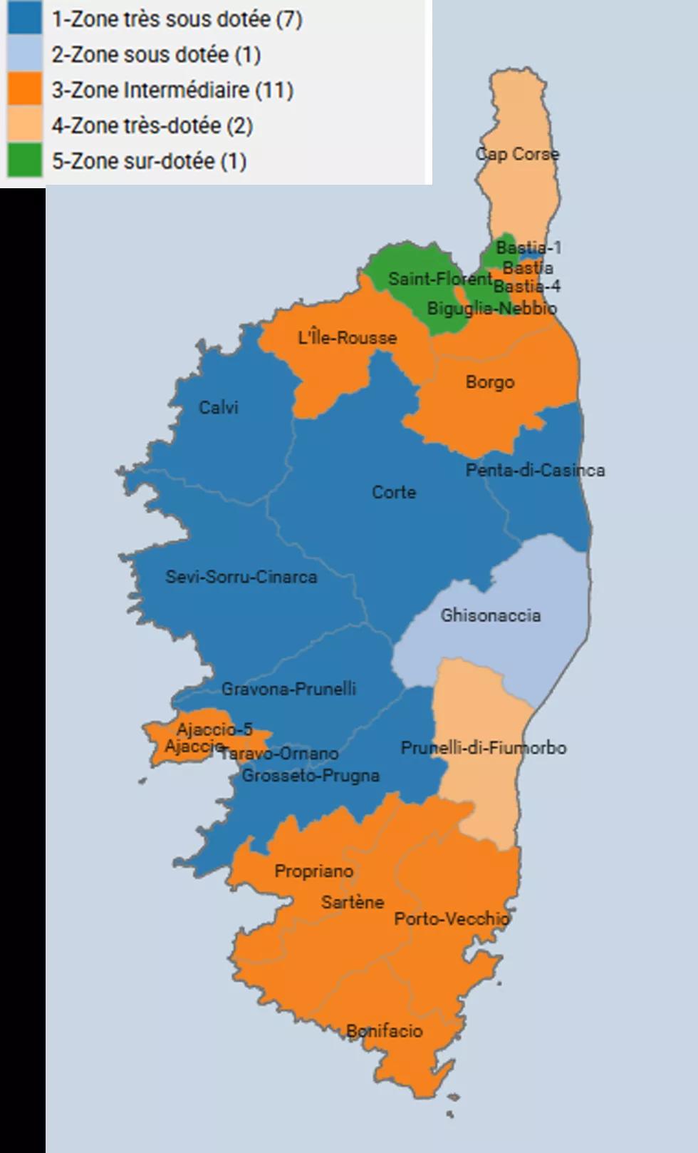 La méthodologie nationale repose principalement sur l’indicateur d’Accessibilité Potentielle localisée (APL) » qui est calculé chaque année par la DREES (direction de la Recherche, des Études, de l'Évaluation et des Statistiques du Ministère de la santé et de la prévention).  Cet indicateur prend notamment en compte l'activité par praticien (nombre de consultations ou visites effectuées dans l'année), le temps d'accès au praticien et la consommation de soins par classe d'âge. L’ARS Corse a fait le choix d’affiner cette méthodologie avec l’appui de la Fédération Corse de la Coordination et l'Innovation en Santé (FCCIS) pour mieux prendre en compte les spécificités régionales ou locales permettant un zonage à une échelle territoriale beaucoup plus fine qu’en 2023.